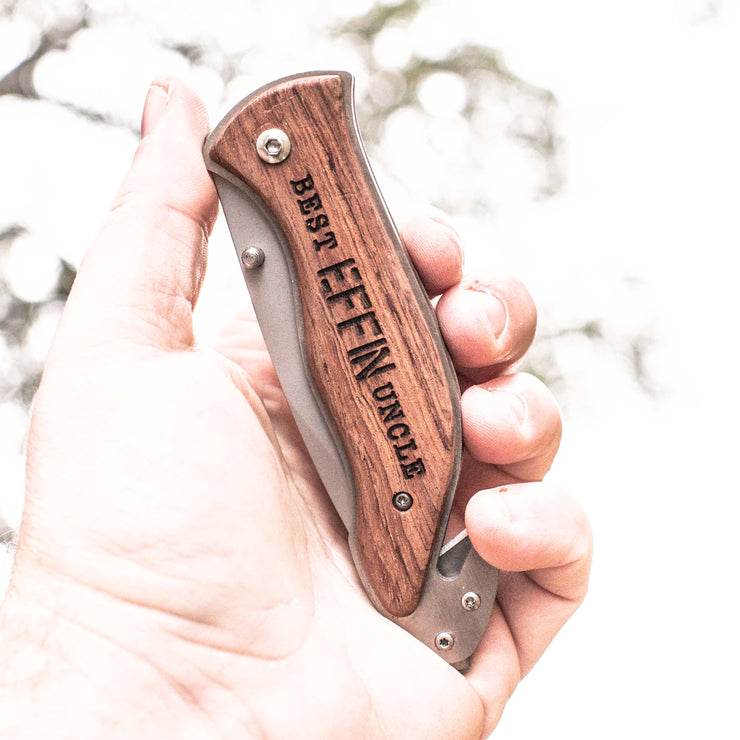 Our favorite knife to engrave, the wooden handles are perfect for our laser engravers